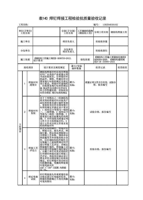 表格名称:130204030102 焊钉焊接工程检验批质量验收记录