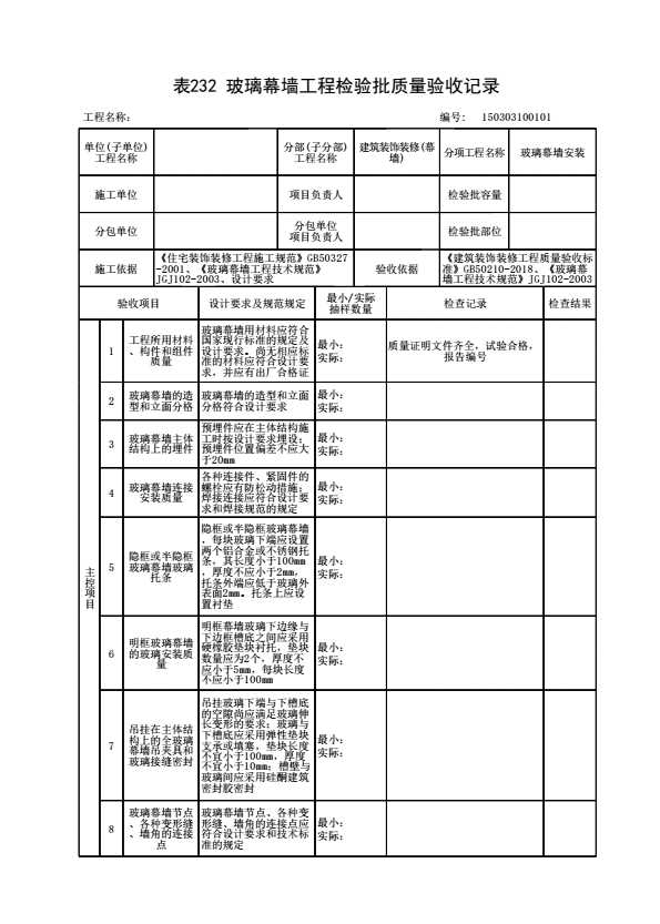 表格名称:150303100101 玻璃幕墙工程检验批质量验收记录