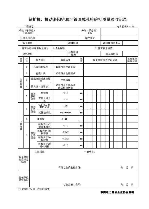 表格名称:电土验表5.4.24 钻扩机、机动洛阳铲和沉管法成孔检验批质量验收记录