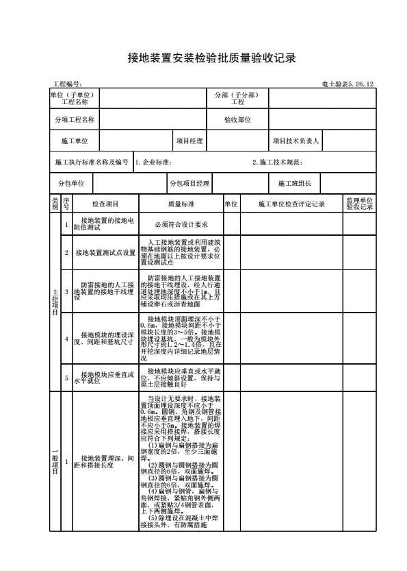 表格名称:电土验表5.26.12 接地装置安装检验批质量验收记录