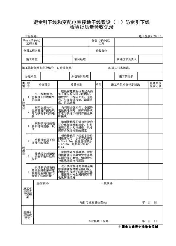 表格名称:电土验表5.26.13 避雷引下线和变配电室接地干线敷设(I)防雷引下线检验批质量验收记录