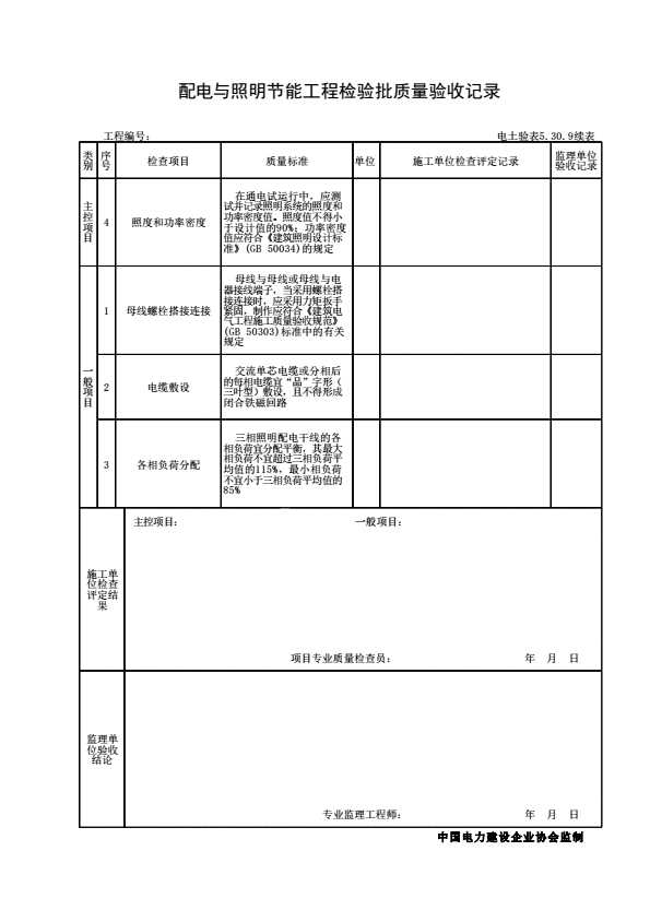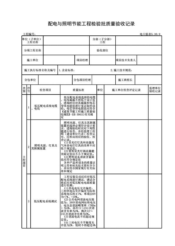 表格名称:电土验表5.30.9 配电与照明节能工程检验批质量验收记录