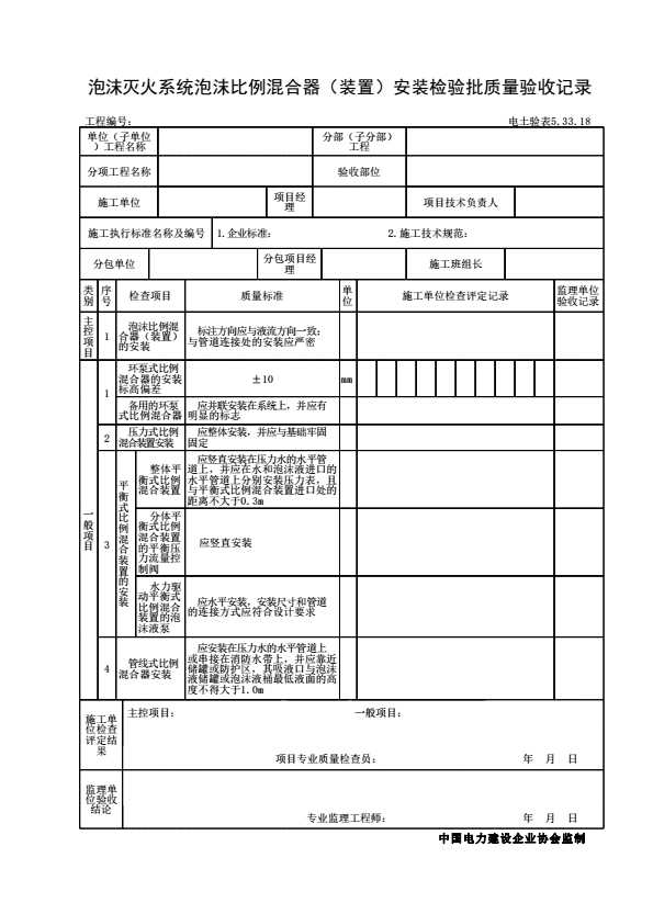 表格名称:电土验表5.33.18 泡沫灭火系统泡沫比例混合器(装置)安装检验批质量验收记录