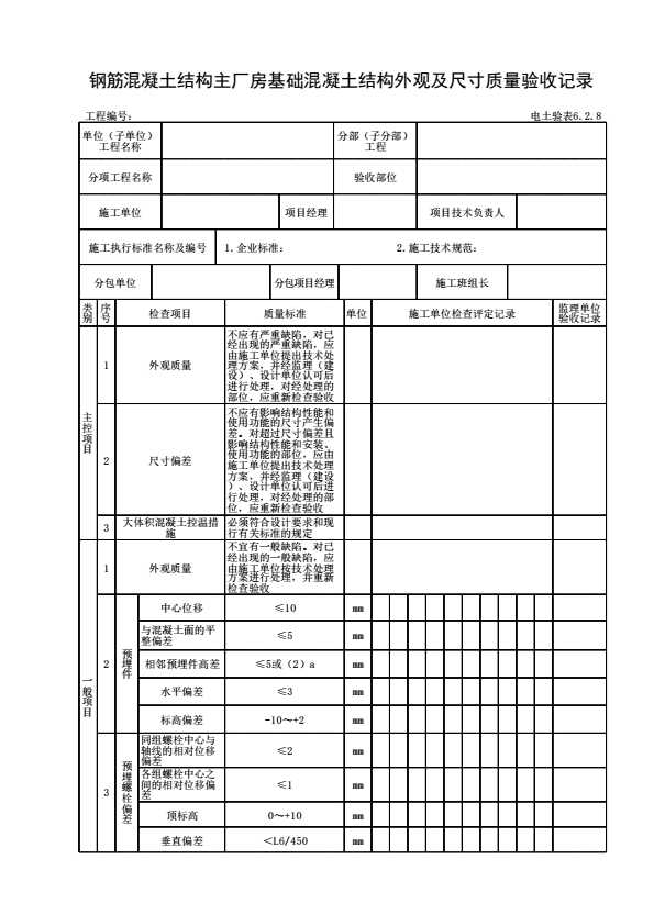 表格名称:电土验表6.2.8 钢筋混凝土结构主厂房基础混凝土结构外观及尺寸质量验收记录