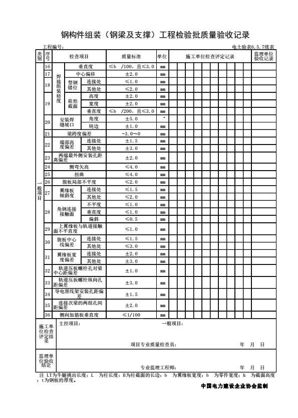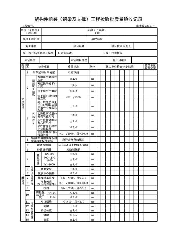 表格名称:电土验表6.5.7 钢构件组装(钢梁及支撑)工程检验批质量验收记录