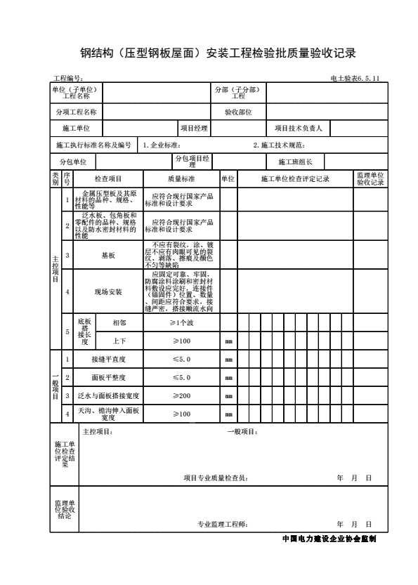 表格名称:电土验表6.5.11 钢结构(压型钢板屋面)安装工程检验批质量验收记录