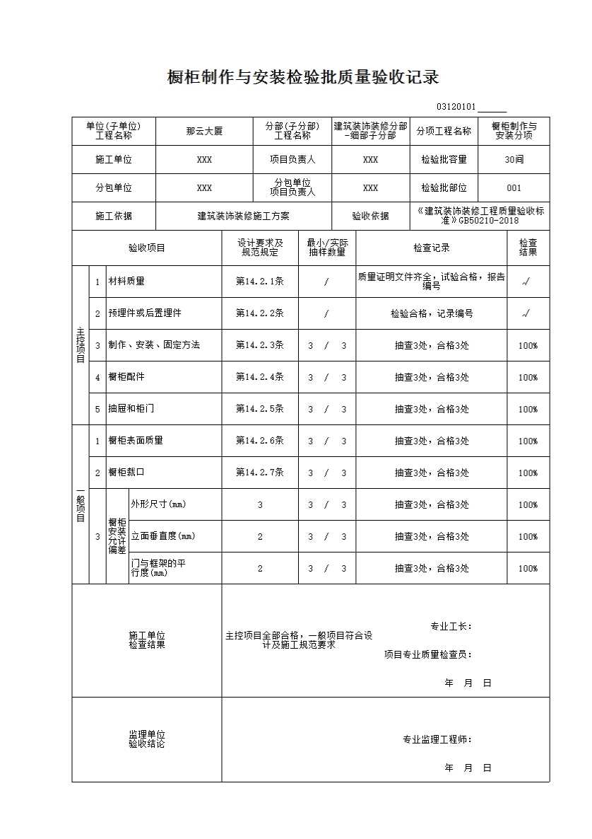 橱柜制作与安装检验批质量验收记录