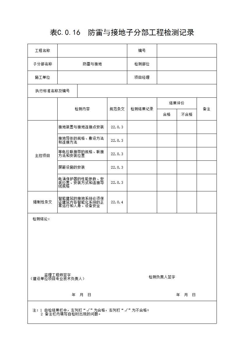 表C.0.16 防雷与接地子分部工程检测记录