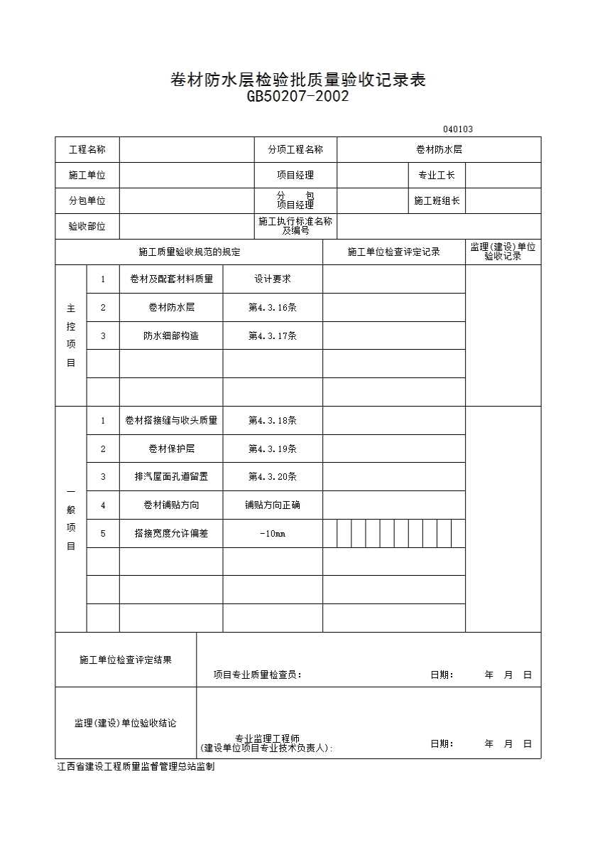 表格名称:040103 卷材防水层检验批质量验收记录表