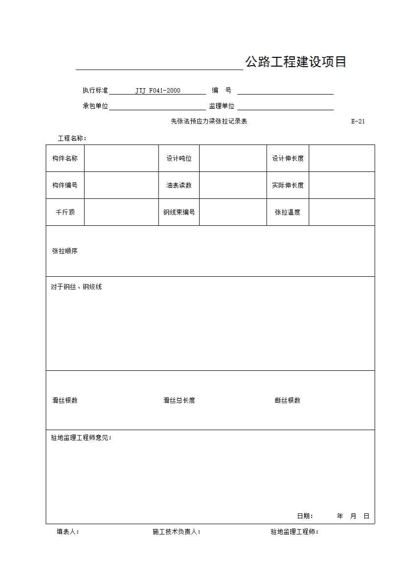 表格名称:E-21表 先张法预应力梁张拉记录表