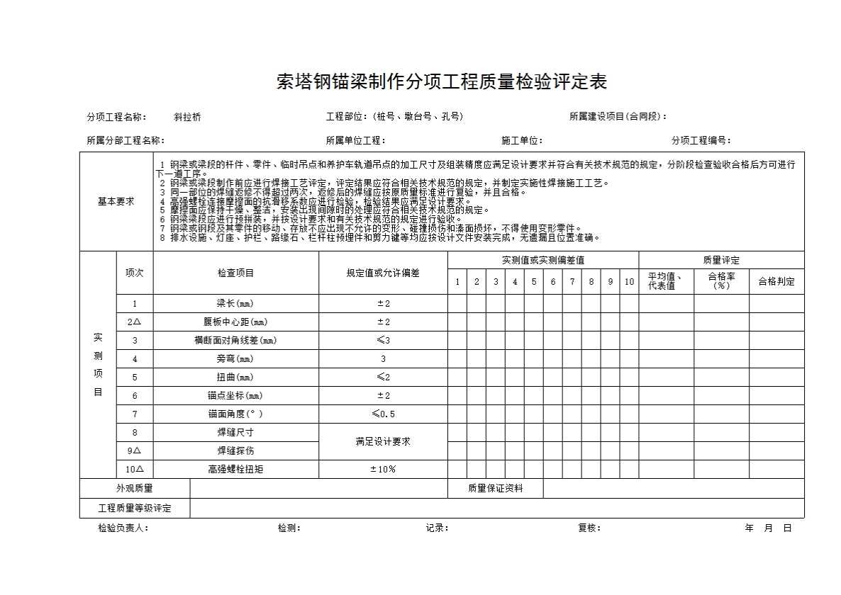 表格名称:索塔钢锚梁制作分项工程质量检验评定表