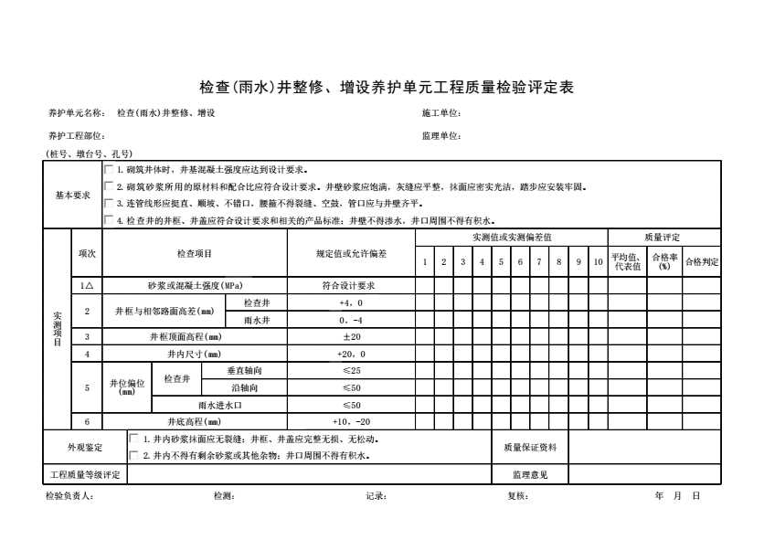 表格名称:检查(雨水)井整修、增设养护单元工程质量检验评定表
