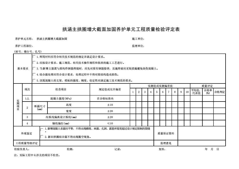 表格名称:拱涵主拱圈增大截面加固养护单元工程质量检验评定表