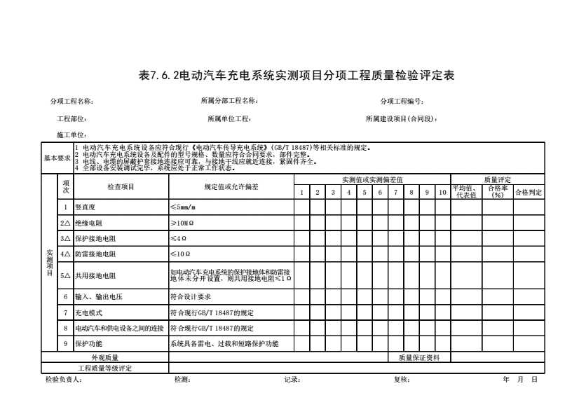 表格名称:表7.6.2 电动汽车充电系统实测项目分项工程质量检验评定表