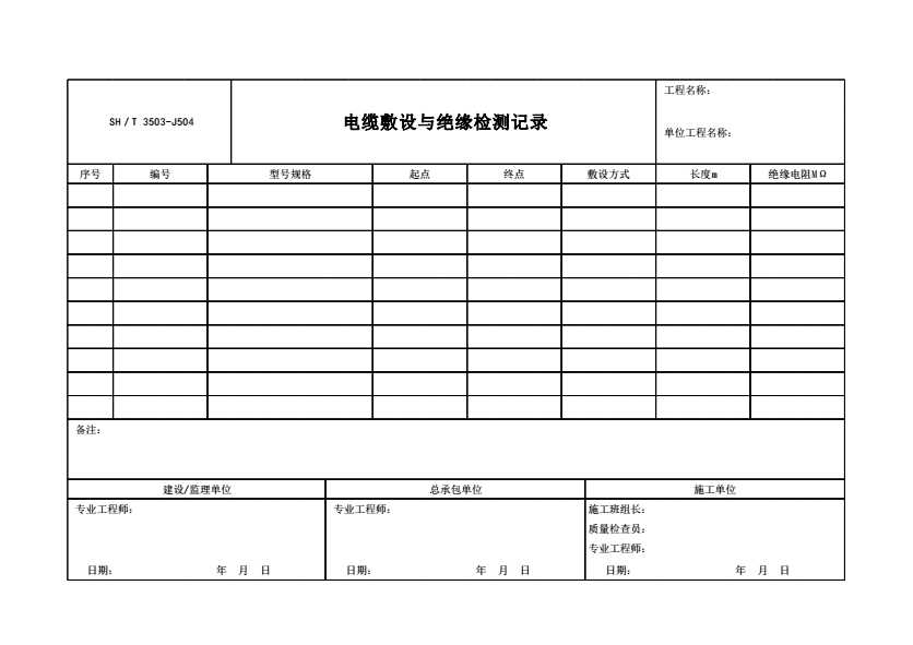 SH/T 3503-J504 电缆敷设与绝缘检测记录