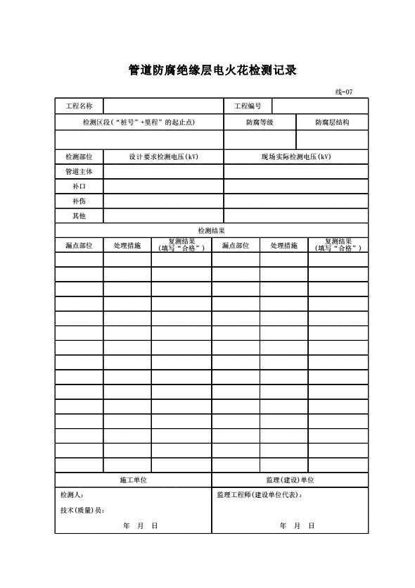 表格名称:线-07 管道防腐绝缘层电火花检测记录
