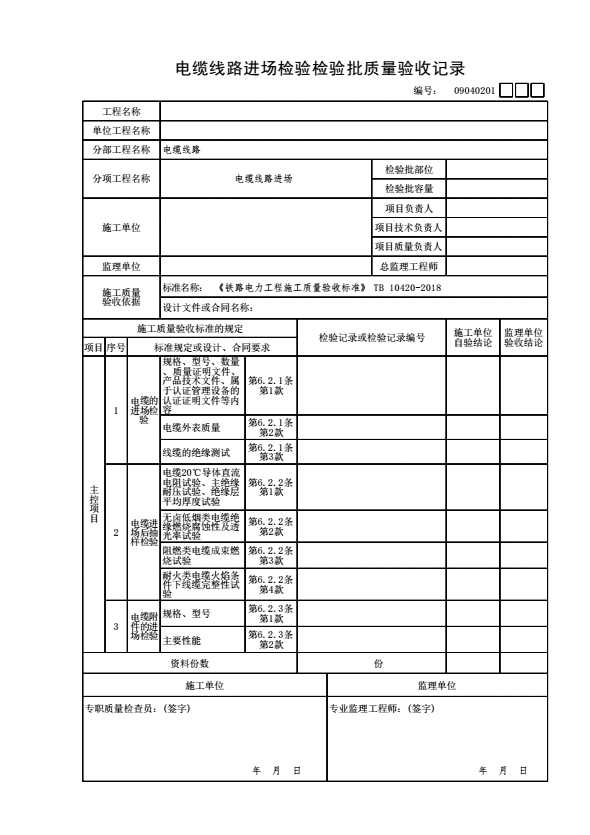 表格名称:09040201 电缆线路进场检验检验批质量验收记录