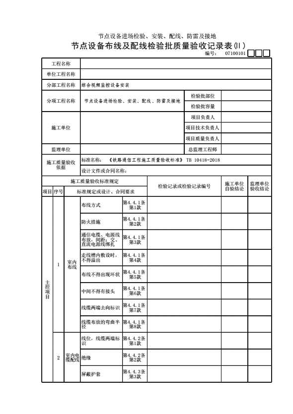 表格名称:07100101 【节点设备进场检验、安装、配线、防雷及接地】节点设备布线及配线检验批质量验收记录表(Ⅱ)