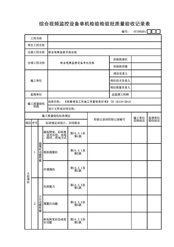 07100201 综合视频监控设备单机检验检验批质量验收记录表