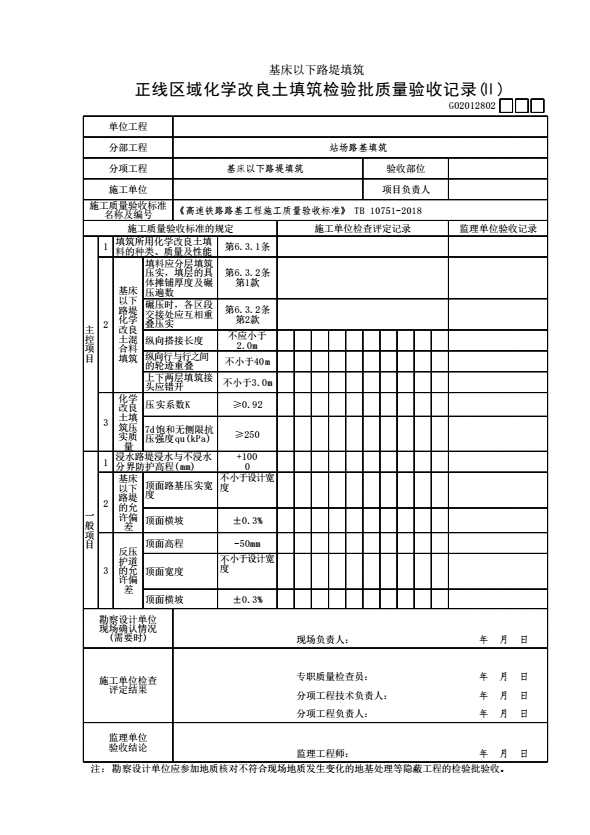 表格名称:G02012802 【基床以下路堤填筑】正线区域化学改良土填筑检验批质量验收记录(Ⅱ)