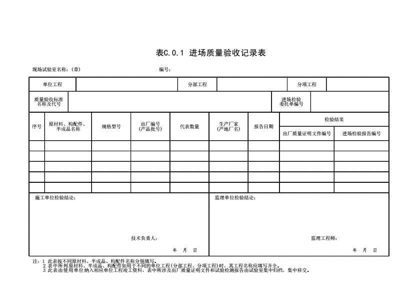 表格名称:表C.0.1 进场质量验收记录表