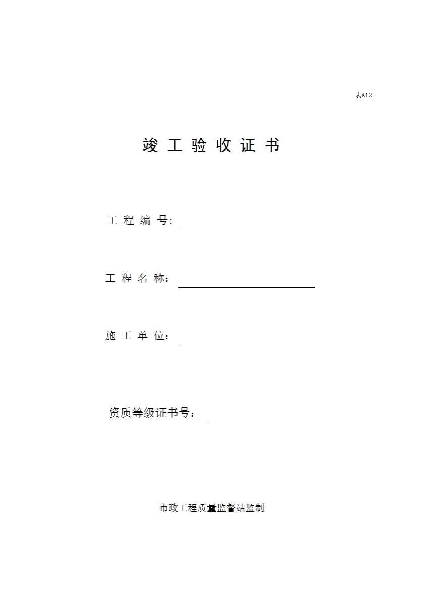 表格名称:表A12 竣工验收证书