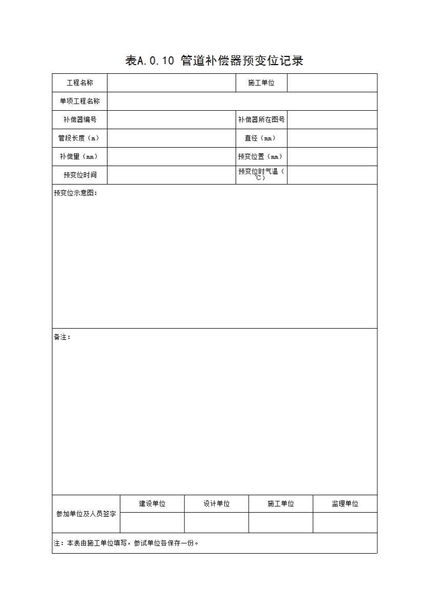表格名称:表A.0.10 管道补偿器预变位记录