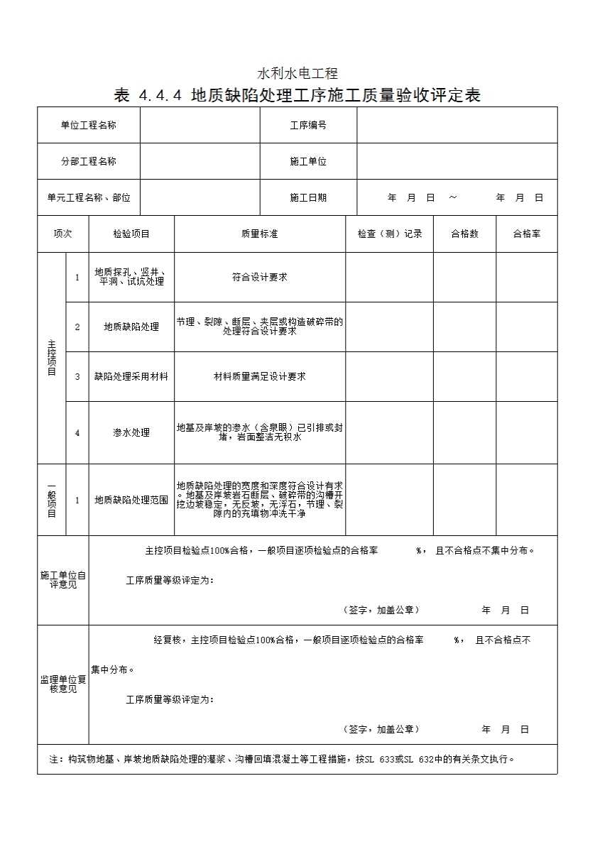 表 4.4.4 地质缺陷处理工序施工质量验收评定表