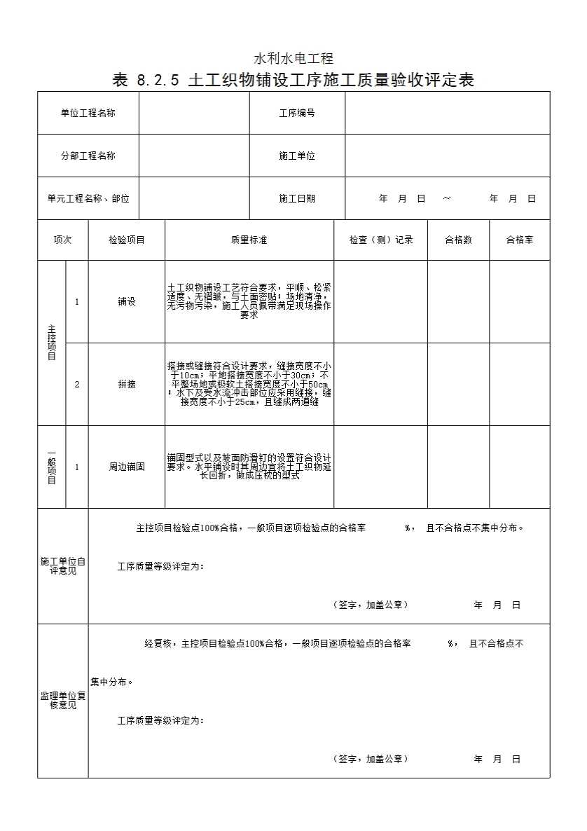 表格名称:表 8.2.5 土工织物铺设工序施工质量验收评定表
