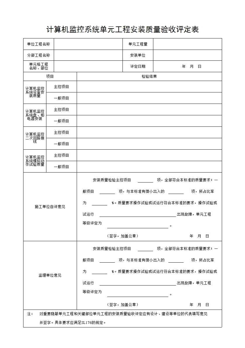 表格名称:计算机监控系统单元工程安装质量验收评定表