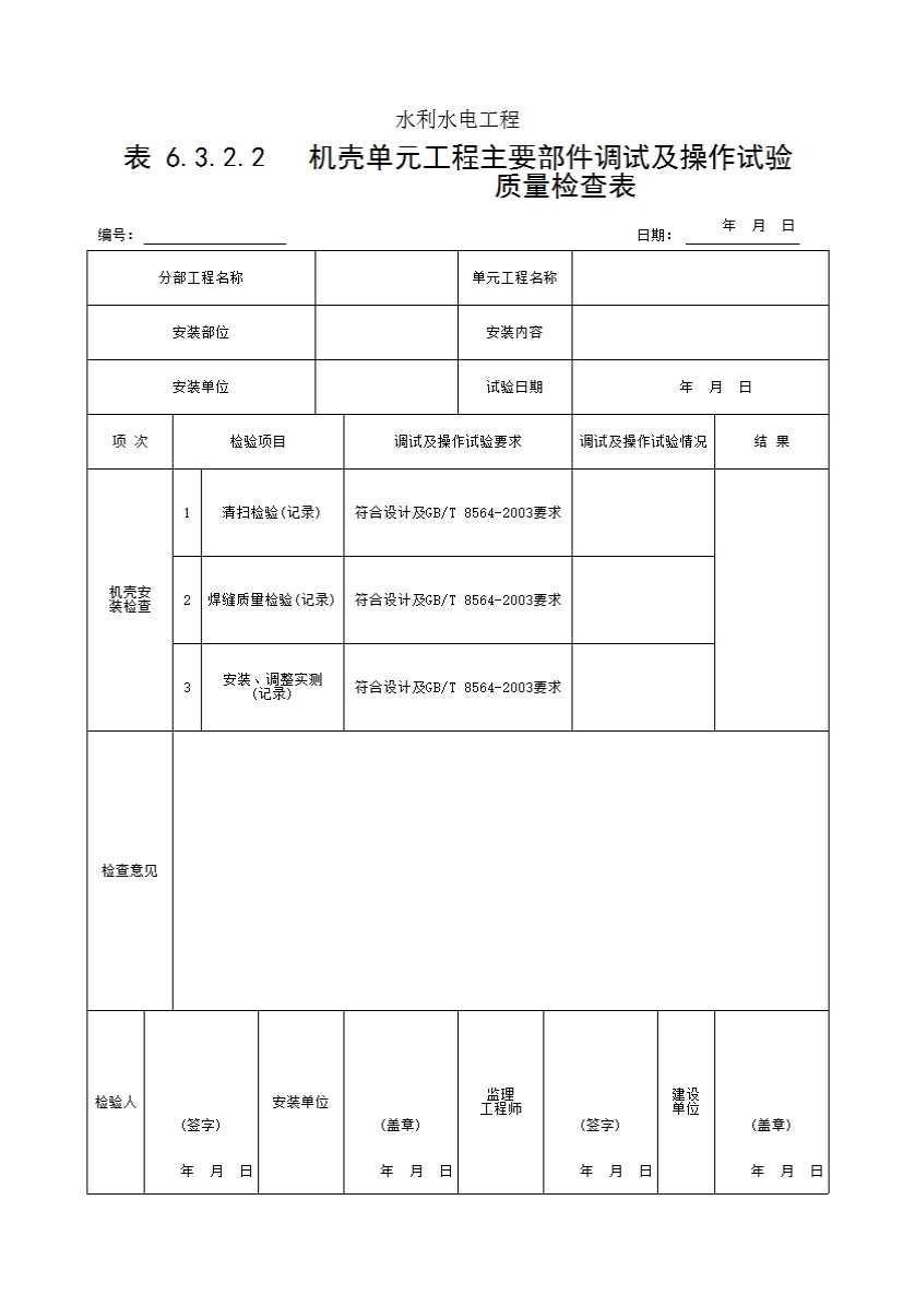 表格名称:表6.3.2.2 机壳单元工程主要部件调试及操作试验质量检查表