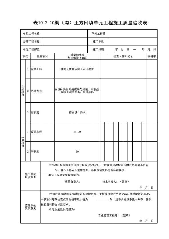 表格名称:表10.2.10 渠(沟)土方回填单元工程施工质量验收表