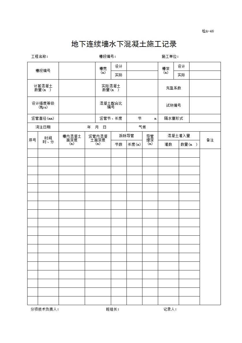 表格名称:46、(评A-46)地下连续墙水下混凝土施工记录