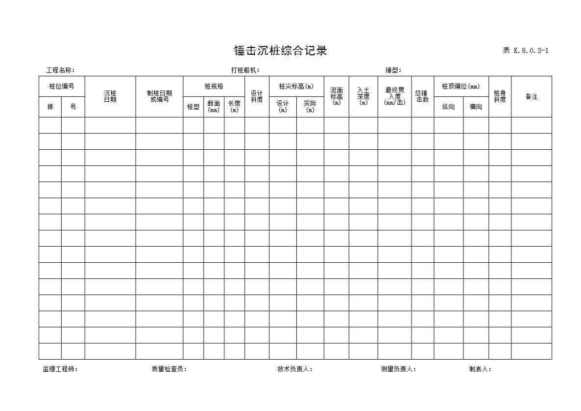 表格名称:表K.8.0.3-1 锤击沉桩综合记录