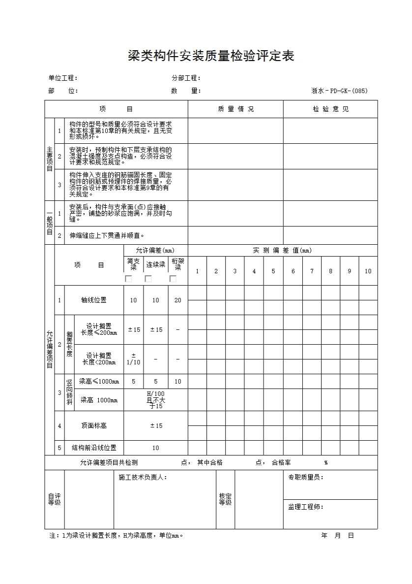 表格名称:085 梁类构件安装质量检验评定表