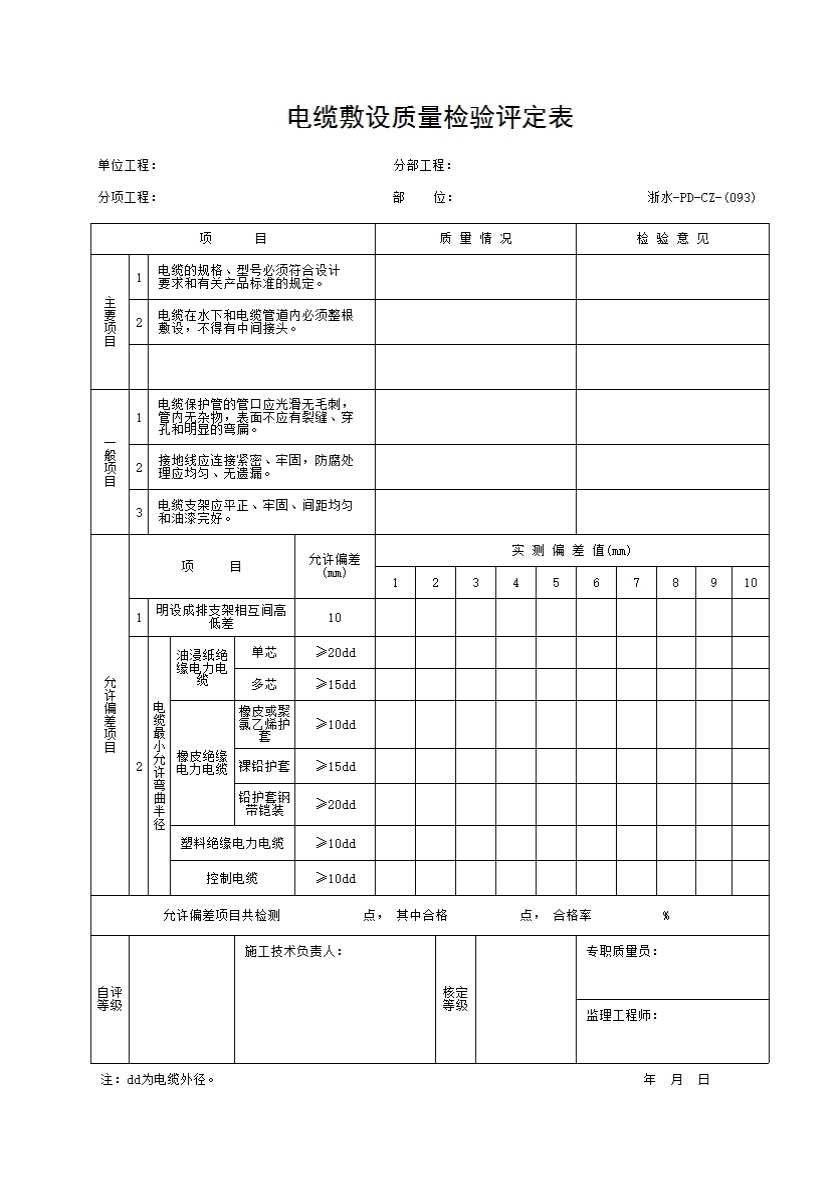 表格名称:093 电缆敷设质量检验评定表