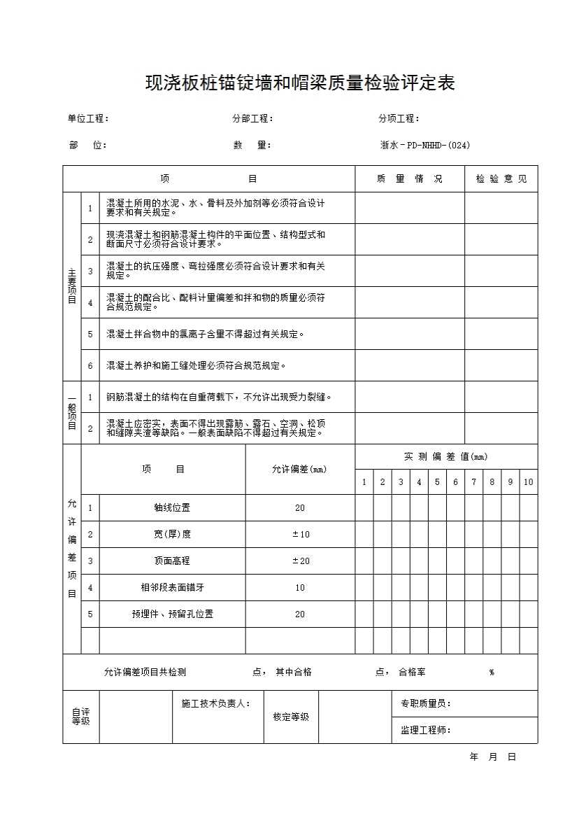 表格名称:024 现浇板桩锚锭墙和帽梁质量检验评定表