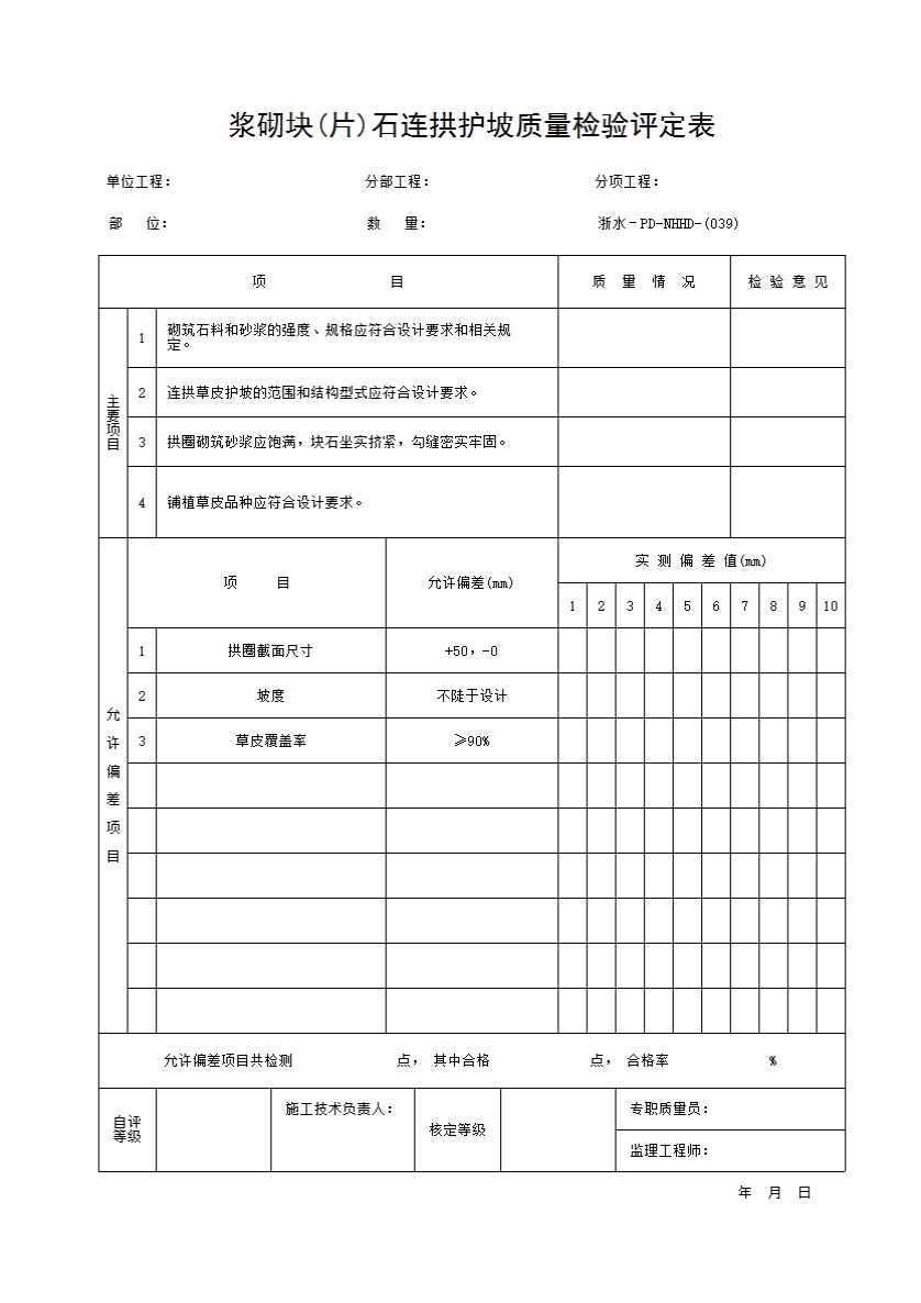 表格名称:039 浆砌块(片)石连拱护坡质量检验评定表