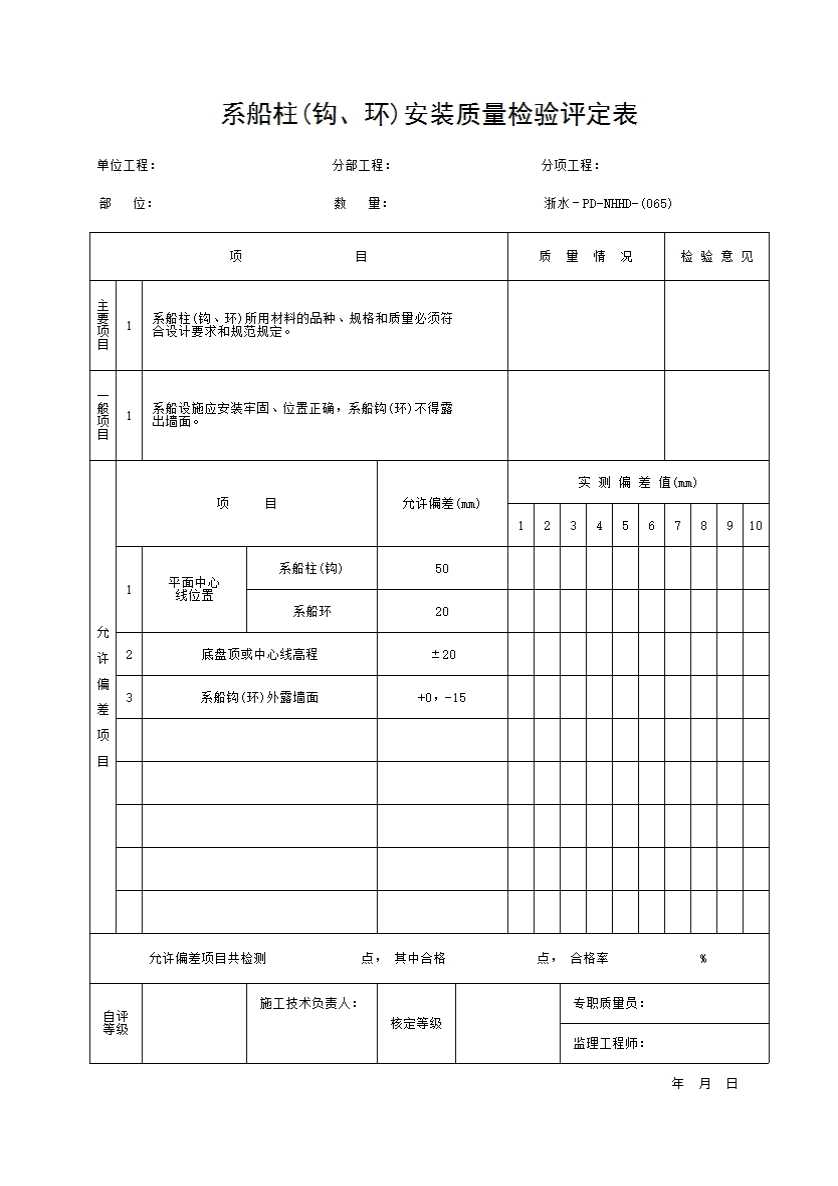 表格名称:065 系船柱(钩、环)安装质量检验评定表