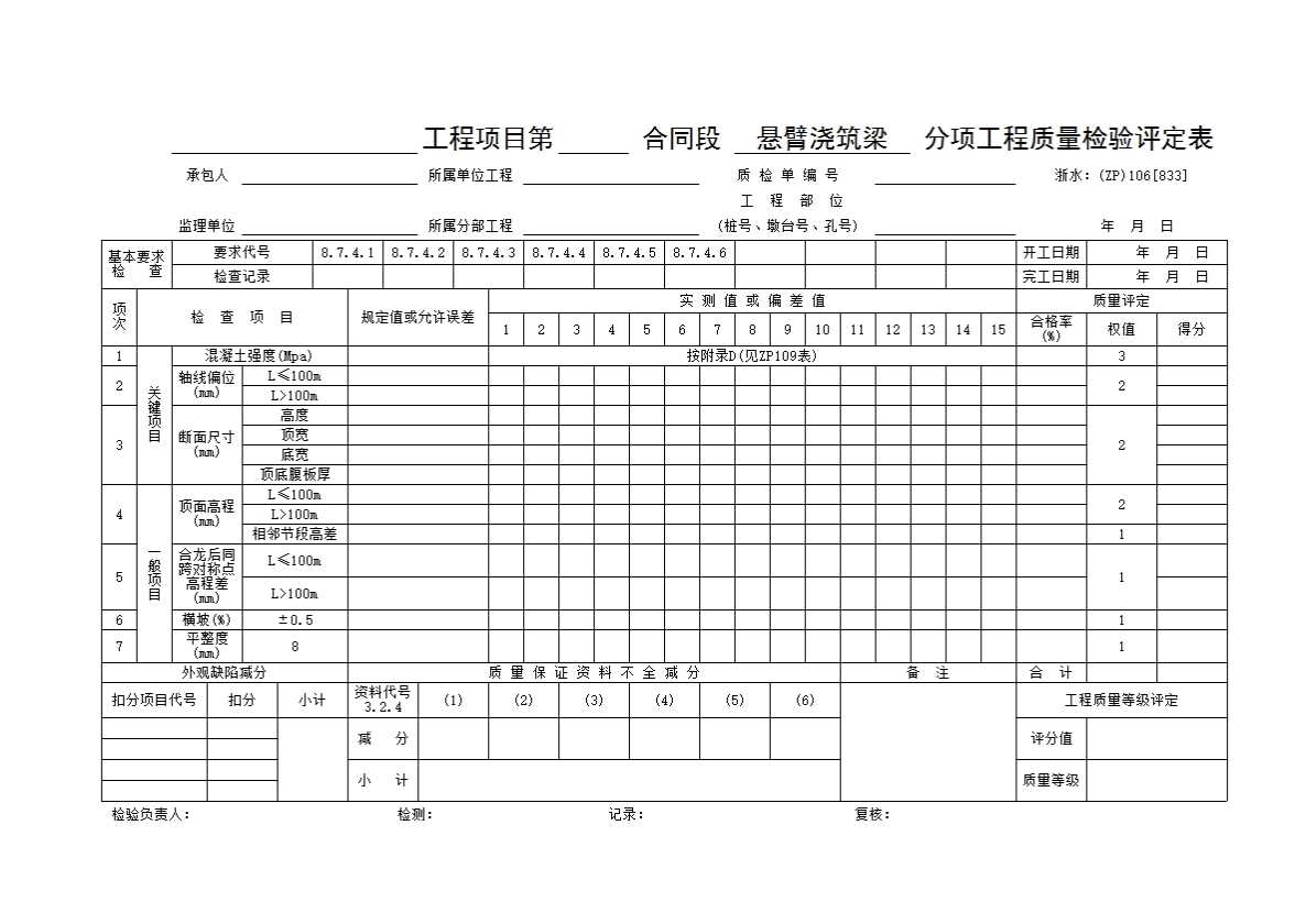 表格名称:033 悬臂浇筑梁分项工程质量检验评定表