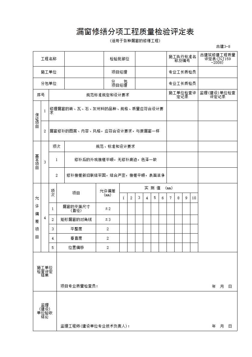 表格名称:古建3-8 漏窗修缮分项工程质量检验评定表