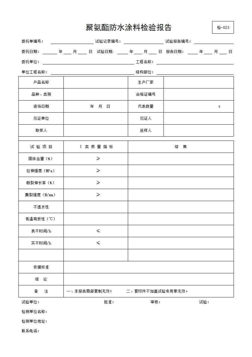 表格名称:聚氨酯防水涂料检验报告