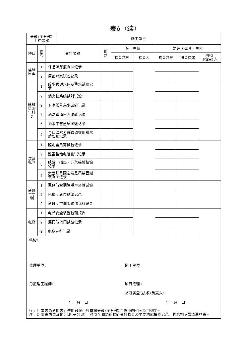 表格名称:表6 分部(子分部)工程安全和功能检验资料核查及主要功能抽查记录表