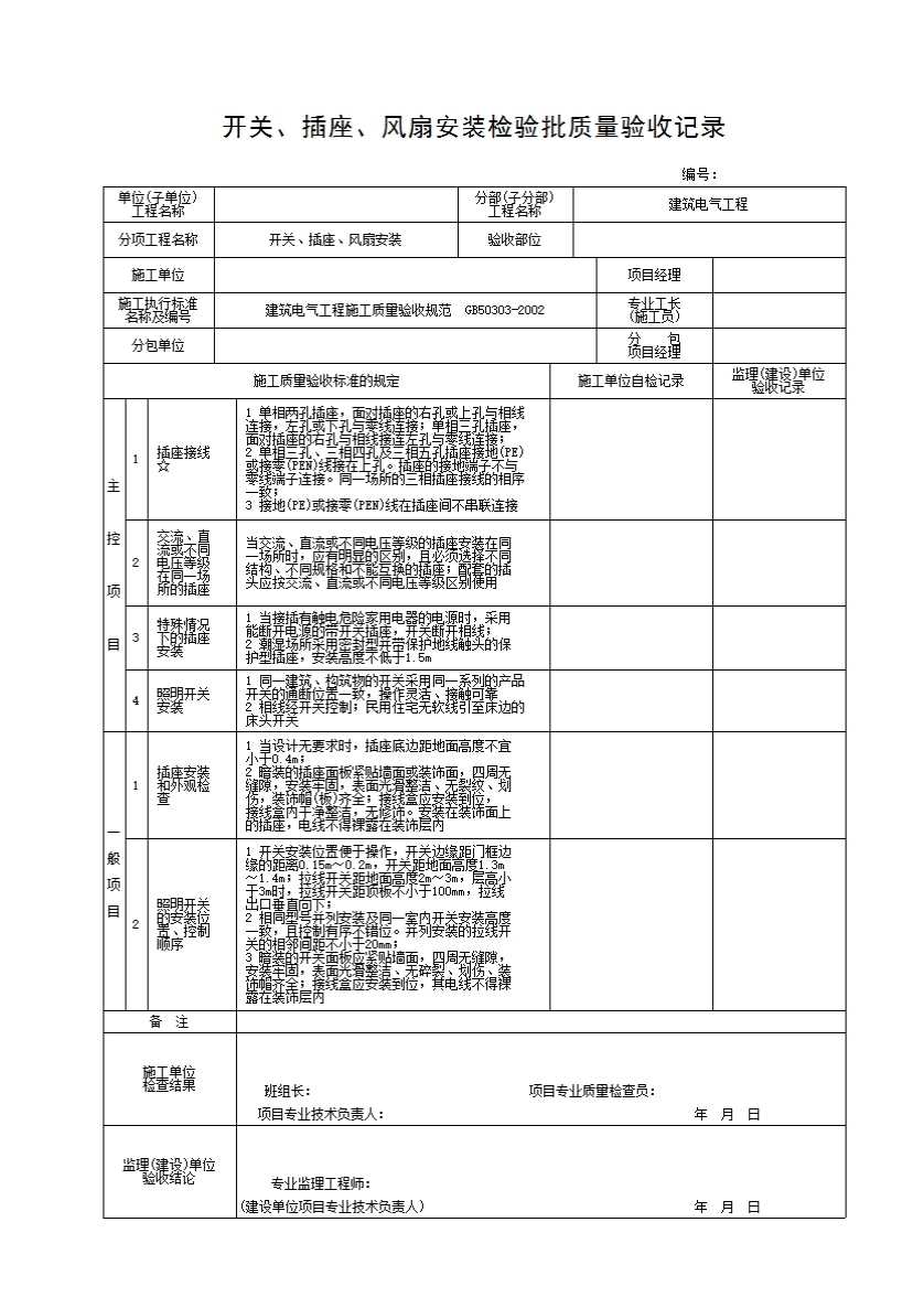 表格名称:开关、插座、风扇安装检验批质量验收记录