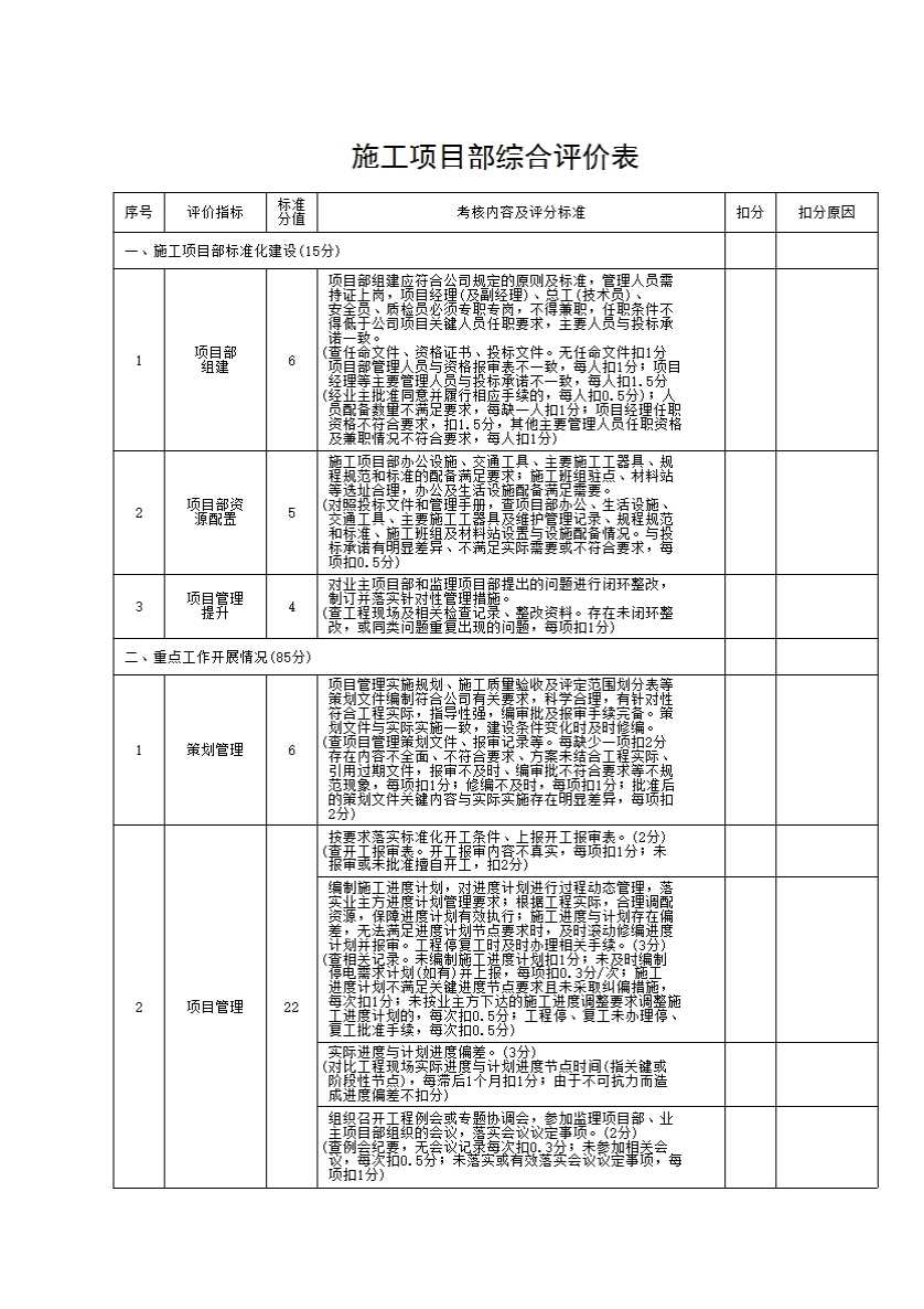 YPJ5:施工项目部综合评价表