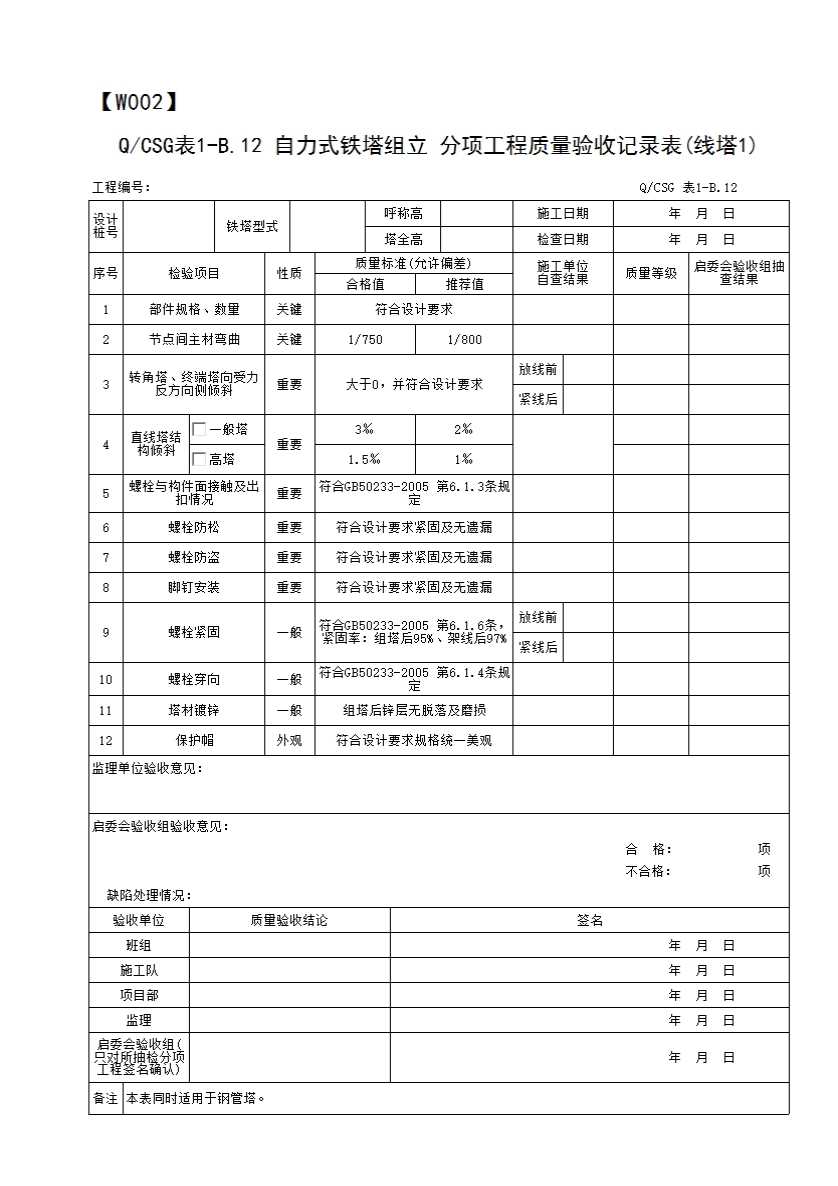 QCSG 表 1-B.12 自力式铁塔组立 分项工程质量验收记录表(线塔1)