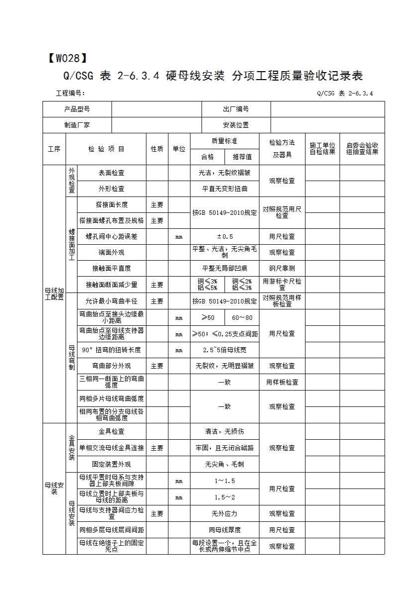 QCSG 表 2-6.3.4 硬母线安装 分项工程质量验收记录表