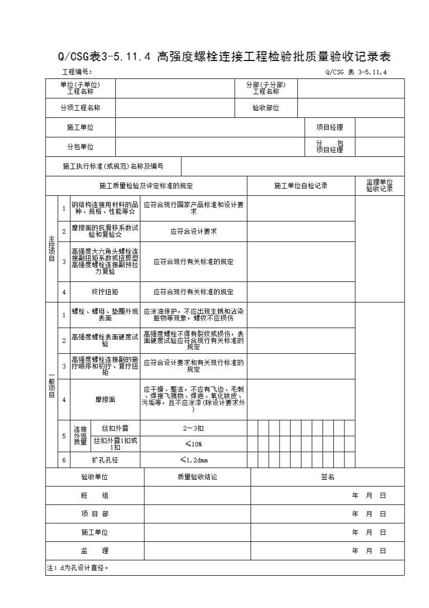 QCSG 表 3-5.11.4 高强度螺栓连接工程检验批质量验收记录表