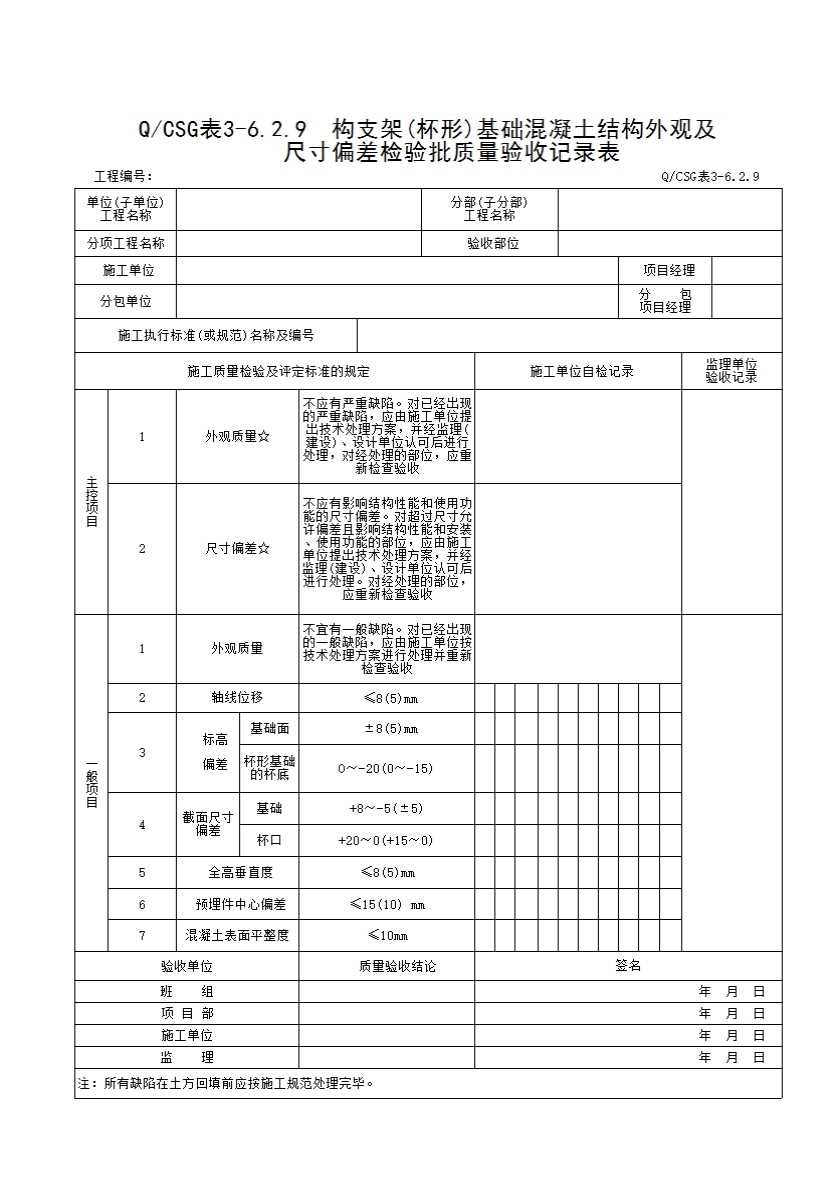表格名称:QCSG 表 3-6.2.9 构支架(杯形)基础混凝土结构外观及尺寸偏差检验批质量验收记录表