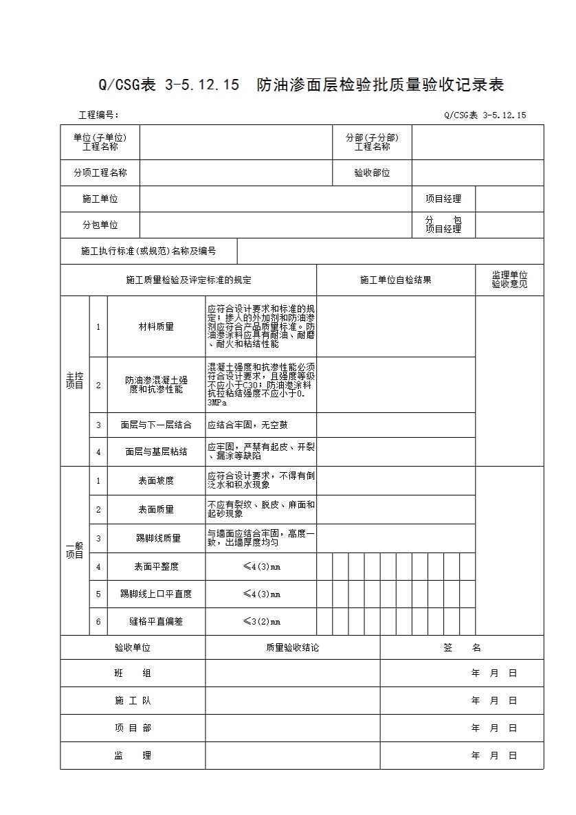 表格名称:QCSG 表 3-5.12.15 防油渗面层检验批质量验收记录表